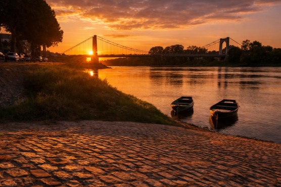 Un soir d’été, après une journée bien remplie au gîte, je décide de me rendre aux quais de Chalonnes-sur-Loire. Je m’installe sur un banc, entourée par l’abondance des fleurs qui ornent les berges. Le soleil, déjà bas, commence sa descente. Le ciel, bleu azur au zénith, se pare de teintes orangées et dorées. Les arbres s’illuminent, leurs feuilles scintillant sous les derniers rayons.