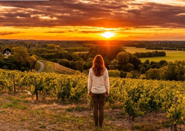Pour finir ma découverte de ces couchers de soleil, je prends la direction de la Corniche Angevine. La route longe le coteau, offrant un panorama exceptionnel sur la vallée de la Loire. Le soleil se couche, colorant le ciel de teintes roses et violettes.