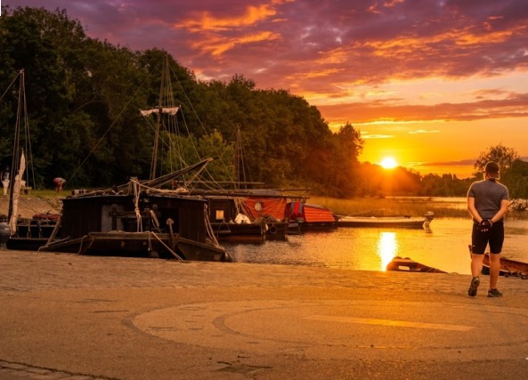 Le lendemain, je me dirige vers le port de la Possonnière. C’est un lieu paisible, où le temps semble s’être arrêté. Je marche le long du quai, observant les bateaux qui se balancent doucement sur l’eau. Le soleil est déjà couché, mais l’horizon s’embrase d’un rouge écarlate. Les reflets se jouent sur la surface de la rivière, créant des arabesques lumineuses.